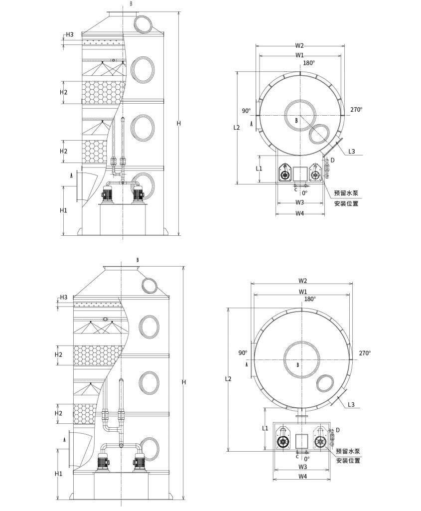 نوع 2: اسکرابر اسپری بسته بندی شده مخزن آب از نوع اسپلیت (قطر برج: Φ2500mm-Φ3500mm)
